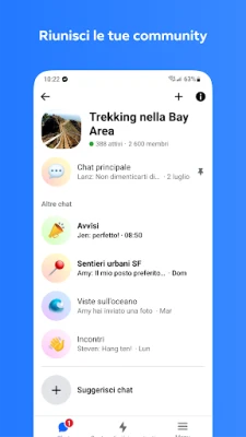 La tua esperienza di messaggistica è completamente nelle tue mani. Hai la libertà di modificare o annullare l'invio di un messaggio entro 15 minuti, e per le conversazioni più private, puoi attivare i messaggi temporanei, garantendo che scompaiano dopo la lettura. Espandi la tua rete con semplicità usando i codici QR per aggiungere nuovi contatti. Coltiva le tue community, connettendoti con persone che condividono le tue passioni, e non perdere mai un aggiornamento dai tuoi creator preferiti, seguendo i loro canali broadcast per contenuti esclusivi. Dai vita alle tue espressioni con un'ampia selezione di sticker animati, GIF e temi personalizzabili, e condividi rapidamente i tuoi pensieri o momenti della giornata tramite le note e le storie, che si dissolvono dopo 24 ore. Messenger è l'hub dove ogni connessione e ogni espressione trovano il loro spazio ideale.